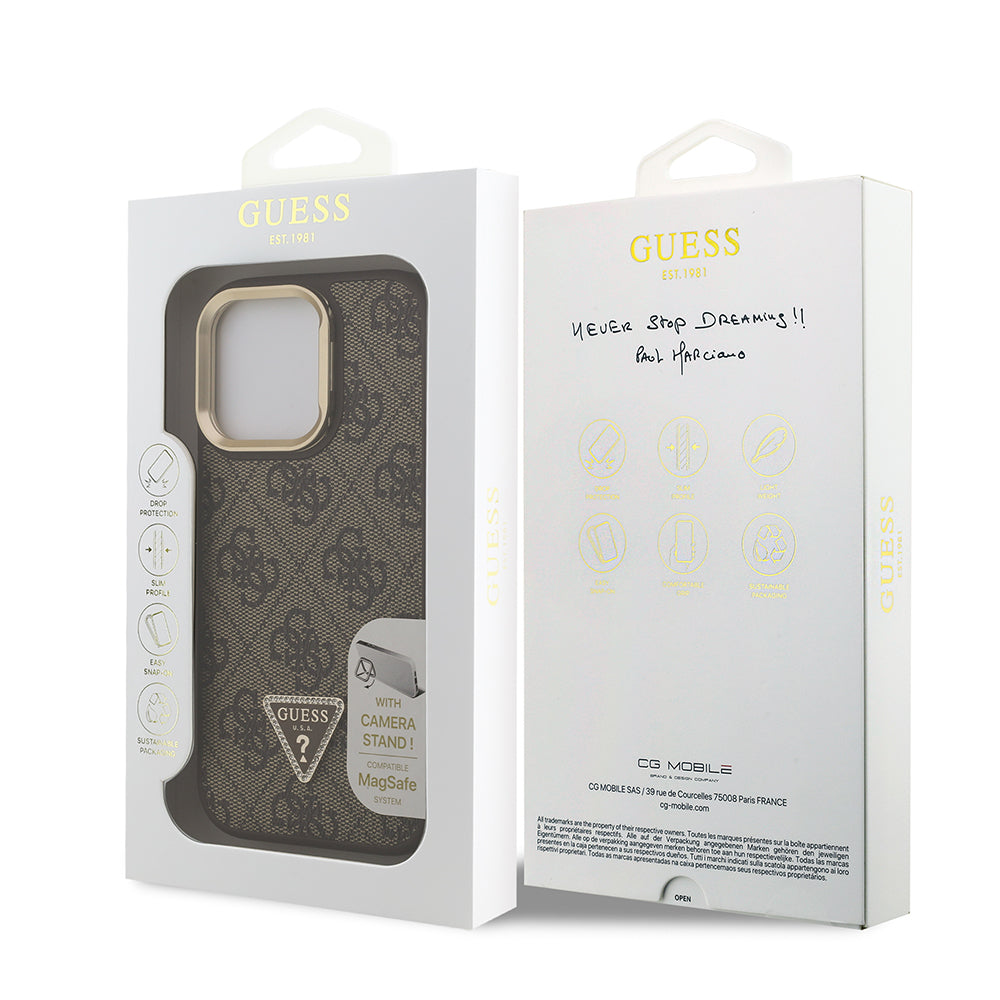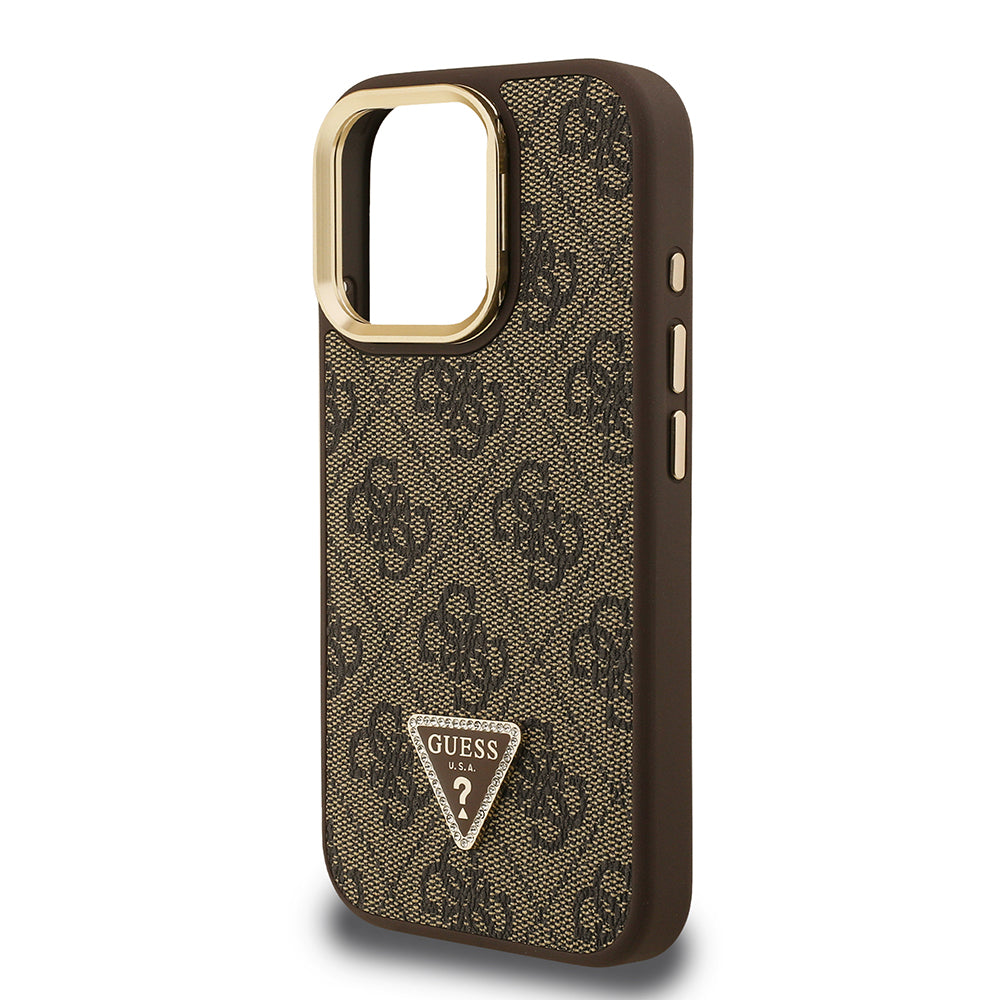 iPhone 15 Pro Max Kılıf Guess Orjinal Lisanslı PU Deri Taşlı Üçgen Logo 4G Desenli Kamera Standlı Kapak