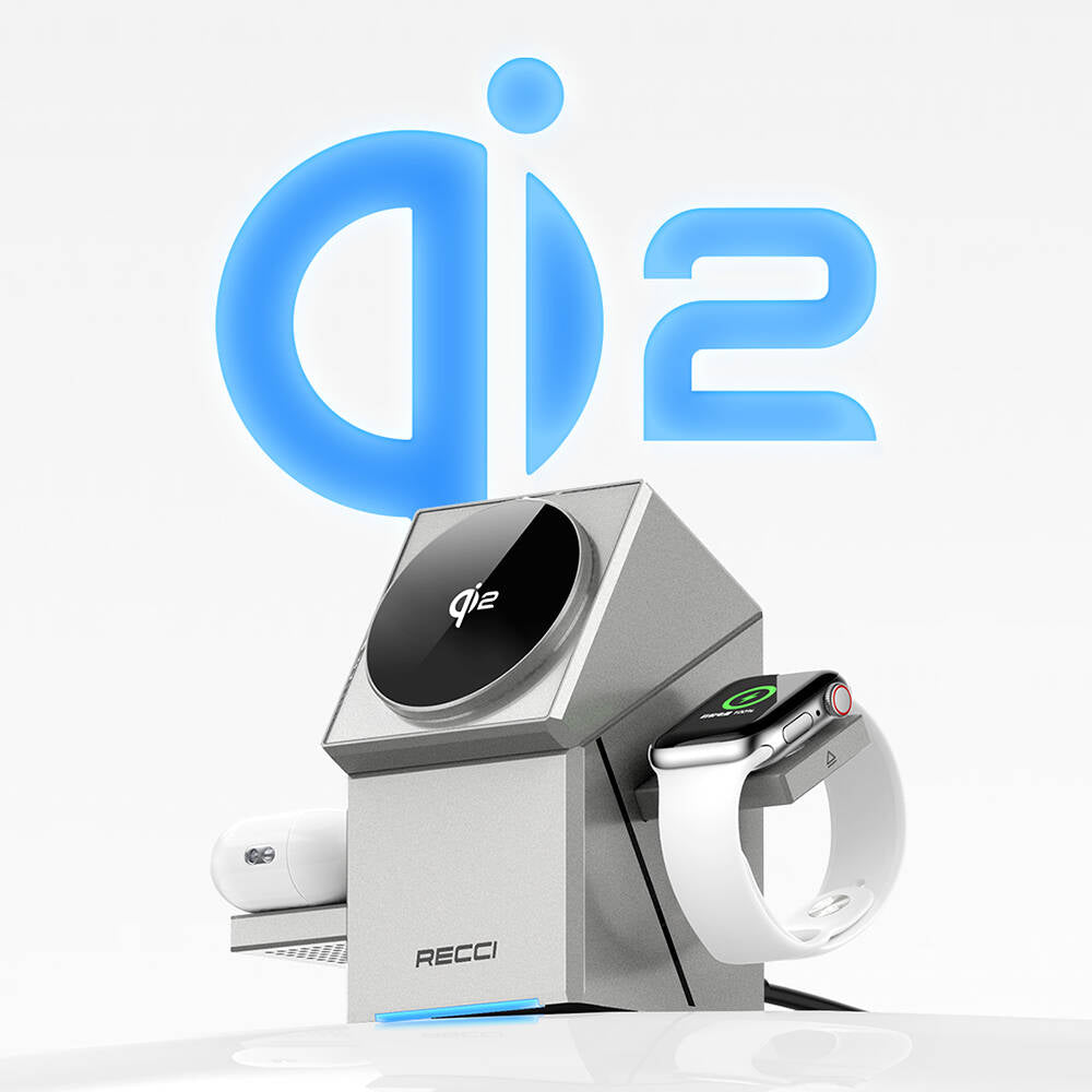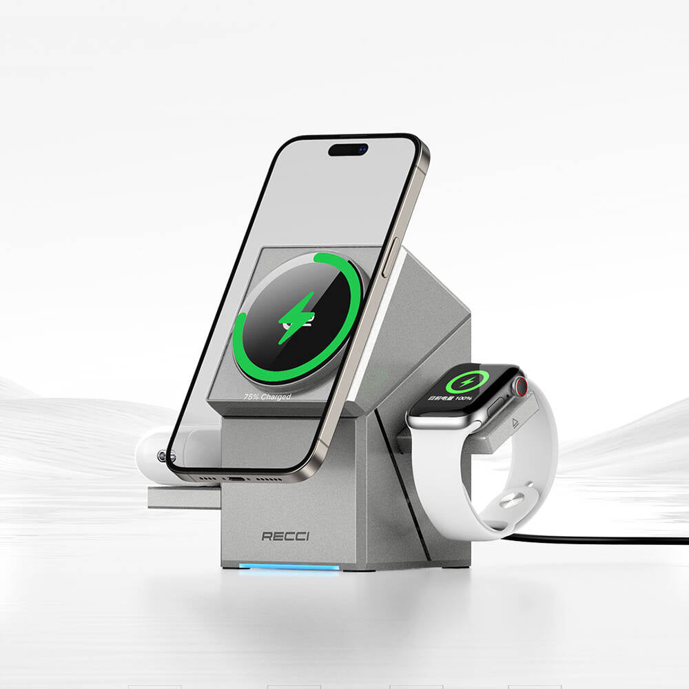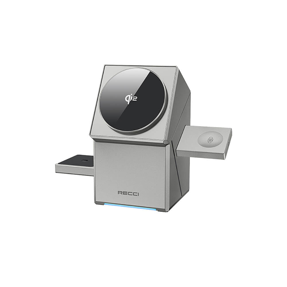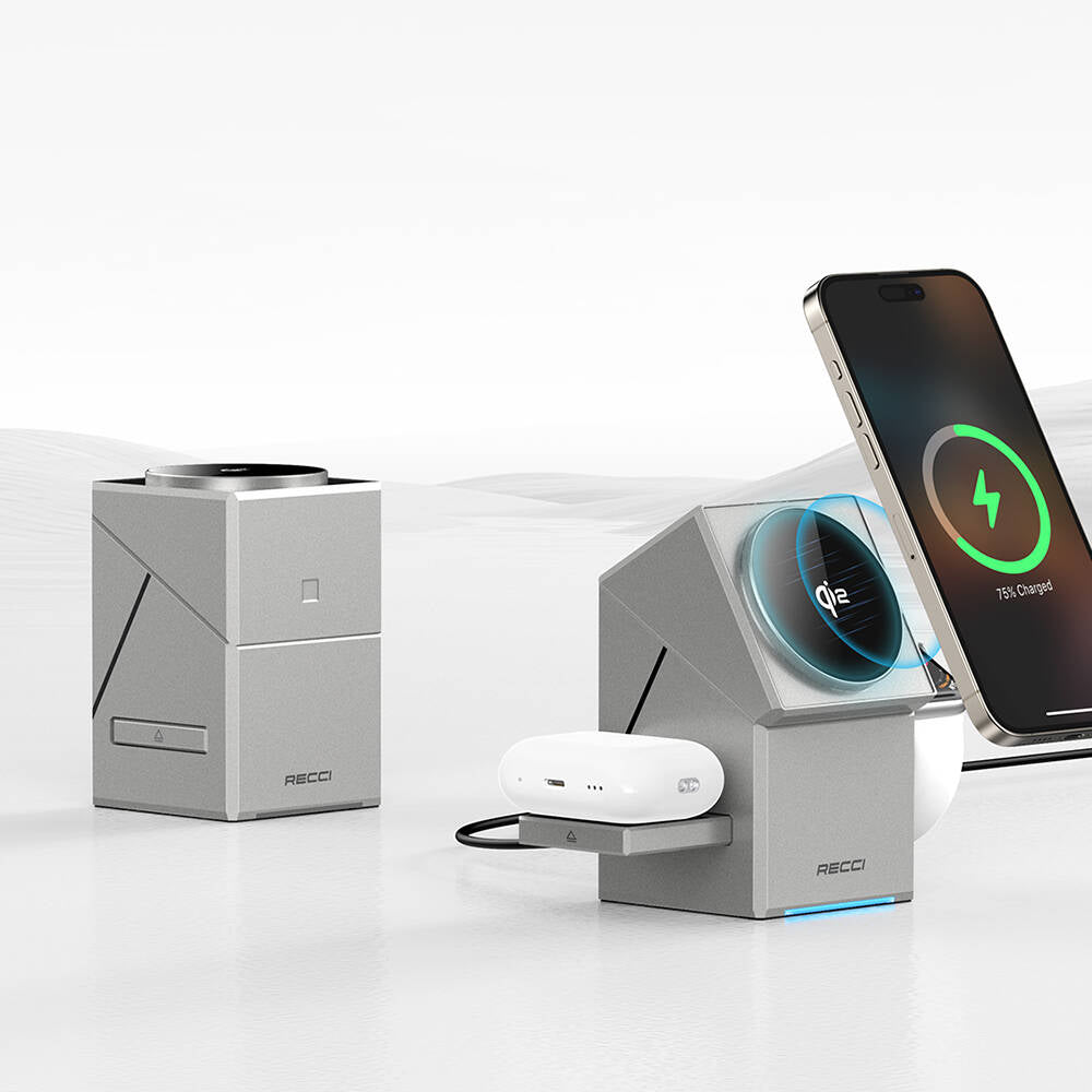 Recci RCW-47 Geometry Serisi Qi2 Şarj Teknolojili Rubik Küp Ambiyans Işıklı Telefon&Akıllı Saat&Kulaklık 15W 3in1 Kablosuz Şarj Standı